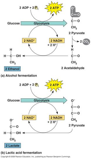 The NADH, reduces the pyruvate into alcohol. It takes place in some fungi (yeast) and bacteria. The glucose is not completely degraded during fermentation. Therefore, a large amount of unusable energy still remains in the products. Only two molecules of ATP are formed during glycolysis and no more ATp is produced. Fermentation is used only to regenerate NM). It produces ethanol as by product. This reaction is .controlled by enzyme pyruvate decarboxylase and alcohol dehydrogenase.