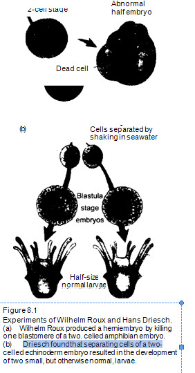 Ans. In separate experiments, Wilhelm Roux (1888) and Hans Driesch (1892) set out to determine whether epigenesis or preformation was correct. Both allowed a fertilized frog, toad, salamanders), killed one of the two cells with a hot needle. Driesch using echinoderm embryos (sea stars, urchins, sea cucumbers), completely separated the divided cells. An entire animal developing from a single cell would support epigenesis. A portion of the animal. developing would favor preformation. Interestingly, Roux described the formation of a half embryo that he called a “Hemiembryo”, and Driesch found that each cell retained the potential to develop into an entire organism. Biologists now know that Driesch was the most correct of the two and that the killed cell, still attached to Roux’s developing amphibian embryo, and • probably altered the – development of the untreated cell Fig. 8.1.