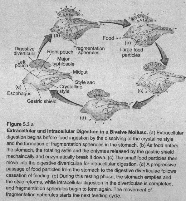 digestive diverticulae for intracellular digestion. These diverticulae in the stomach increase the surface area for absorption and intracellular digestion. Intracellular digestion releases the nutrients into the blood and produces the fragmentation spherules that both excrete wastes and lower the pH for optimal extracellular digestion. Sorting of food separates fine particles from indigestible coarse materials which are sent on to the intestine. Partially digested food from the stomach enters a digestive gland for intracellular digestion. Cilia carry indigested wastes in the digestive gland back to the stomach and then to the intestine. There is no marked division of gut into midgut and hind gut. The intestine empties through the anus near the excurrent siphon.