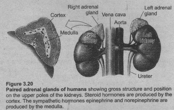 When nerve cells are excited by some form of stressful stimulus, they release the neurotransmitter acetylcholine in the adrenal medulla. Acetylcholine combines with receptors on the cells, stimulating the release of epinephrine. Norepinephrine is released independently of epinephrine. Its functions are similar to those of epinephrine, but its primary role is in sustaining blood pressure, while epinephrine generally has a stronger effects on heart and metabolic rates. The adrenal cortex, like adrenal medulla, reacts to stress. But it responds to endocrine signals rather than to nervous input. Fig. 3.21.