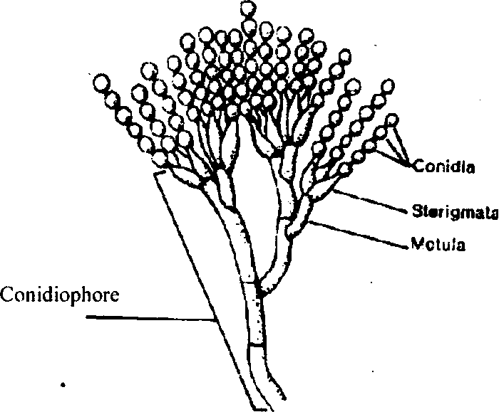 The branches may be equal or unequal. Each branch bears at its tip a group of short branches called metulae. Bottle shaped sterigmata are present at the tip of each metula;Conidia are produced in chains at the tips of sterigmata. The whole group of metulae and sterigmata on each branch is called peneillus. The number of sterigmata on each metula and the number of metulae on each branch are constant for cach species.