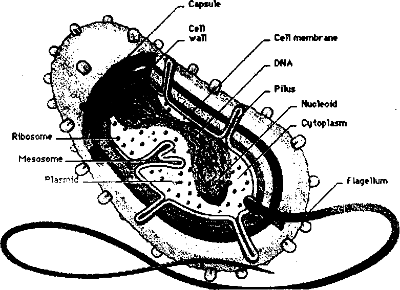Bacteria are unicellular prokaryotes. They lack true nucleus and other membranous bound organdies. Some species form colonies. Most prokaryotic have diameter between 1-5Am. Bacterial cell is composed of following structures: flagella, cell envelope, cell membrane, cytoplasmic matrix, spores.