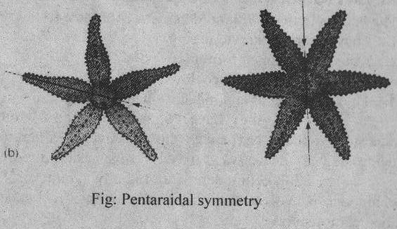 Modern echinoderms have a radial symmetry. This radial symmetry is called pentaradial symmetry. Their body parts are arranged in fives, or multiple of five, around an oral-ahoral axis. Radial symmetry is an adaptation for sedentary or slowly moving animals. It allows a uniform distribution of sensory. feeding and other structures around the animal. Some motile echinoderms have secondarily returned to bilateral symmetry.