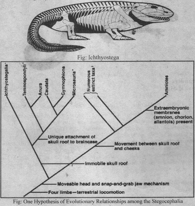 First amphibian: No one knows what the first amphibian was. The structure of limbs, skulls and teeth of lchthyostega are similar to the earliest amphibians. Two lineages of amphibians are formed in the late Devonian and early Carboniferous periods. These lineage can be differentiated by the structure of roof and the attachment of posterior portion of the skull to each other.