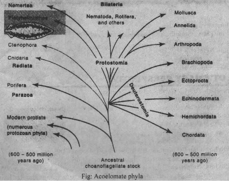 Other zoologists believe that triploblastic acoelomate was formed from a bilateral ancestor. Primitive acoelomates and triploblastic were formed earlier than the radiate phyla. Therefore the radial, diploblastic plan was secondarily derived from it.