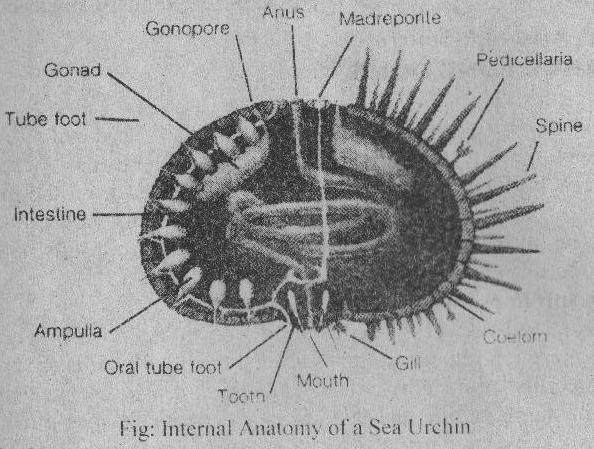 Echinoids have a large coelom. The coelomic fluids are the primary circulatory medium. Small gills are present in thin membranes around the mouth. Gills are out pockets of the body wall. These gills are lined by ciliated epithelium. Gas exchange occurs by diffusion through the epithelium and the tubefleet. Ciliary currents changes in coelomic pressure. The contraction of muscles associated with Aristotle’s Lantern move coelomic fluids into and out of gills. Excretory and nervous functions are similar to asteroids.