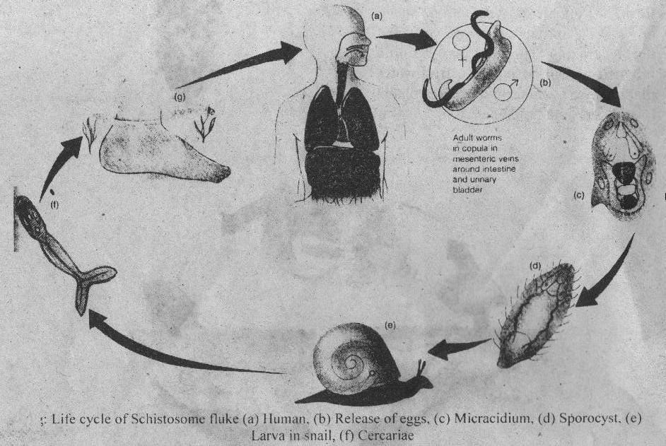 Schistosomes have great medical importance. They infect over 200 million people throughout the World. Infections are most common in Africa, South and Central and Southeast Asia. The adult is dioecious worms. They live in the human bloodstream. The male fluke is shorter and thicker than the female. The sides of the male body curve under. It terms a canal along the ventral surface (schistosoma means split body). The female fluke is long and slender. It is carried in the canal of the male. Copulation is continuous and the female produces thousands of eggs over her lifetime. Each egg contains a spine. This spine helps in the movement of it through host tissue. These eggs are eliminated in feaces or urine. The eggs of schistosomes lack operculum. miracidium escapes through a slit into water. The miracidium finds a snail by chcmotaxis. The miracidium penetrates it. It develops into a sporocyst and then daughter sporocysts. It finally forms cercariae. The cercariae have forked tail. There is no rediae generation in it. The cercariae leave the snail. It penetrates the skin-of a human. It has anterior glands. They glands secrete digestive enzyme that help in penetration. The cercariae lose their tails in human. They develop into adults in the intestinal veins. Metaccrcaria stage is absent in them.