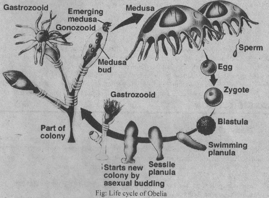 3. Medusae: Obelia has small medusae. It forms a stalk like structure of the gonozooid. When medusae mature, they break free of the stalk. It swims out through an opening at the end of the gonozooid. Medusae reproduce sexually and give rise to more colonies of polyps.