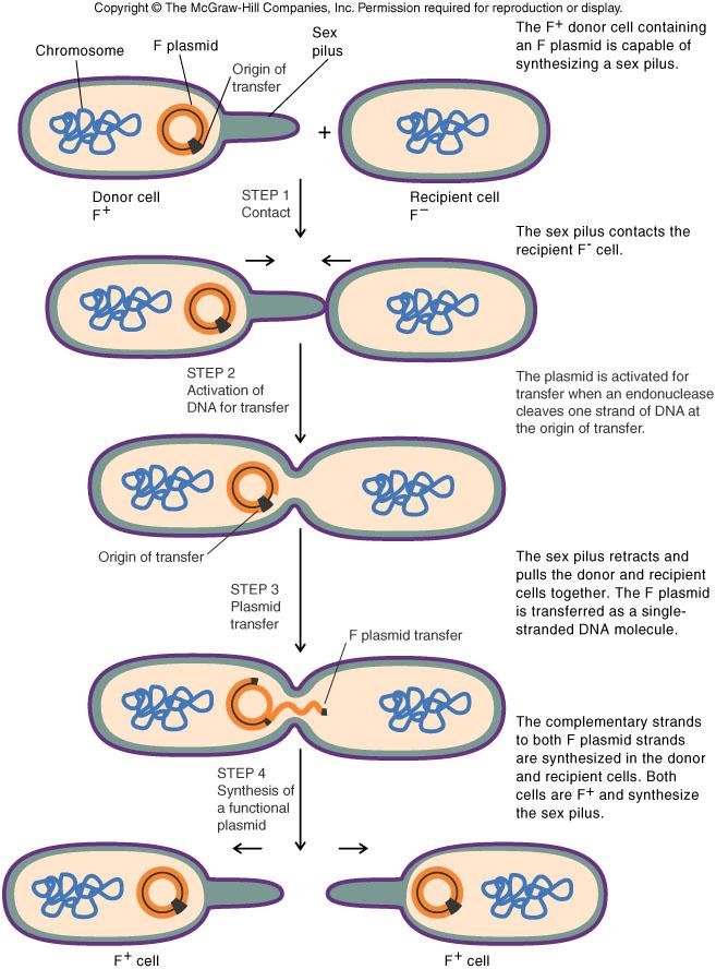5. Mating always occur between F and F. F-plasmid is integrated into the host genome. Donor chromosomal DNA may be transferred along with plasmid DNA. The chromosome of donor bacteria replicated before this transfer. Therefore, its genes are not lost. The amount of chromosomal DNA that is transferred depends on timing of contact. For common laboratory strains of E. coli the transfer of the entire bacterial chromosome takes about 100 minutes. The transferred DNA can be integrated into the recipient genome via recombination.