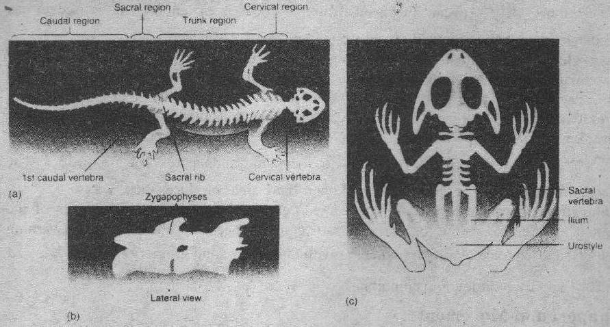 Fig: Skeletons of Amphibians. (a) The salamander skeleton is divided into four regions: cervical, trunk, sacral and caudal. (b) Interlocking processes, called zygapophyses. (c) A frog skeleton shows adaptations for jumping