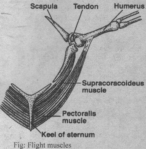 The flight muscles are the largest and strongest muscles of birds. They are attached to the sternum and clavicles. ‘their other end is attached to the humerus. The muscles of most birds are adapted physiologically for flight. Flight muscles must contract quickly. They are fatigued very slowly. These muscles have many mitochondria and produce large quantities of ATP. ATPs provide energy for flight. Domestic fowl have massive amounts of muscle (“white meat”). The humans like it as food. These muscles contain fibers for rapid contraction. But they have few mitochondria and poor vascularization. Therefore, they are poorly adapted for flight.