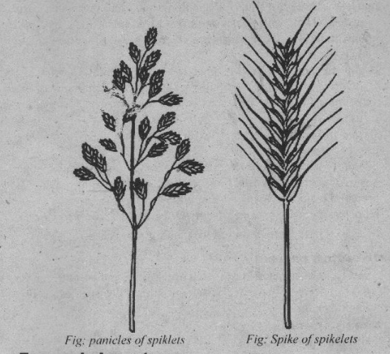 Panicles of spikelets: The spiklets are arranged on a branched axis-panicle as in oat.