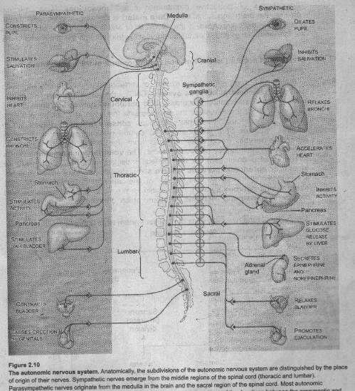 The extremely complex nervous system of vertebrates is divided into two main divisions – the central nervous system (CNS), composed of brain and spinal cord is site of information processing; and peripheral nervous system (PNS), composed of all the nerves of the body outside the brain and spinal cord. The peripheral nerves are divided into two groups: sensory (afferent) nerves, which transmit impulses from receptors to the central nervous system; and motor (efferent) nerves, which carry impulses from the central nervous system to voluntary and involuntary nervous systems. The voluntary or somatic nervous system relays commands to the skeletal muscles, and the involuntary or visceral or autonomic nervous system stimulate smooth and cardiac muscles and glands of the body. The nerves of the autonomic system divide into: sympathetic nervous system, responsible for the ‘light or flight” response; and the parasympathetic nervous system which functions during relaxation. Fig.2.10