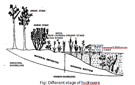 The plants are entirely submerged near the bank of lake or pond. These are the pioneers of the hydrosere. They include several flowering plants like Hydrilla, Potamogeton etc. These plants grow at various depths. They are mostly rooted in the muddy or sandy bottom. Light can penetrate there. There are death and decay of the submerged plants. Thus material is collected at the bottom of the lake. It becomes. shallow. Therefore, the habitat becomes unsuitable for the submerged plants.