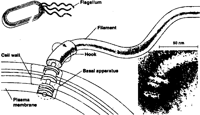 Flagella are extremely thin hair like appendages. They originate from basal body and come out through cell wall. The basal bodies are present just beneath the cell membrane in the cytoplasm. The bacterial flagella is made of about 20 proteins, with another 30 proteins required for its regulation and assembly. Flagella are chiefly made up of a protein flagellin. Most of the bacilli and spiral shaped bacteria have flagella. Cocci rarely have flagella. Flagella of prokaryotes and eukaryotes differ from each other. Prokaryotic flagella are one-tenth of the width of eukaryotes. Bacterial flagella are not covered by extension of membrane. Bacteria are classified into different taxonomic groups on the basis of presence of flagella, pattern of attachment of flagella and the number of flagella.