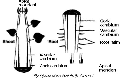 1. Apical Meristems: The meristems present at the tips of roots and shoot are called apical meristems. Apical meristems are involved in the extension of plant body. the perpetual growls zones are present at the-apices of roots and stems. They increase the number of cells at the tips of roots and stem. Thus they play important role in primary growth. The cells derived from apical meristems are grouped into three types:
