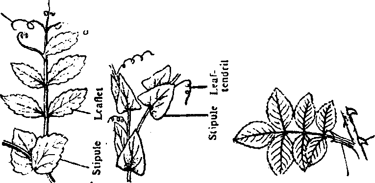 2.Leafy stipules: These are large greiii and leaf like stipules. they are edible in some plants likt sweet pea. In sonic plants like edible pea. these are modi lied into tendrils.