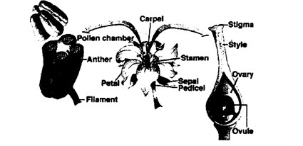 The adult plant of angiosperm is diploid sporophyte. It is heterosporous Sporophyte is a dominant generation. It is differentiated into roots, stem and leaves. It produces flower at 1,.turity. Sporophyte produces microspores and megaspores. A flower is a modified shoot (stem and leaves). A flower consists of a pedicel, thalamus or torus and floral leaves (sepal, petal, stamens and carpals). Thalamus and floral leaves, especially stamens and carpel are much modified. Therefore, they do not look like stems and leaves. Flower has following floral parts: