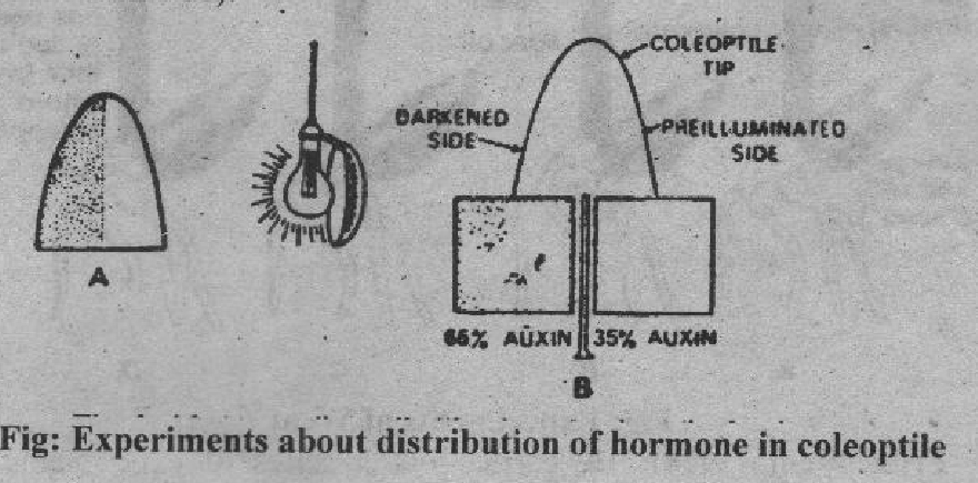 Then the coleoptile was partially separated at the base by a thin piece of glass. Now more auxin diffused from the darkened half than the illuminated. About 30 IAA units collected from darkened half and 10 IAA units were collected from the illuminated half. These results suggest that unequal distribution of auxin causes phototrOpism.