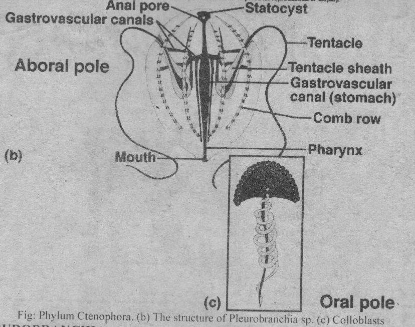 1. Comb rows: Pleurobranchia has eight meridional (vertical) hands cilia. I These cilia are called comb rows. Comb rinks are present between the oral and aboral poles. Comb rows are locomotory structures. They are coordinated by a statocvst. Statocvsts are at the aboral pole. Pleurobranchia normally swims with its aboral pole present downward. The statocyst detects tilting. The comb rows adjust the animal’s position.