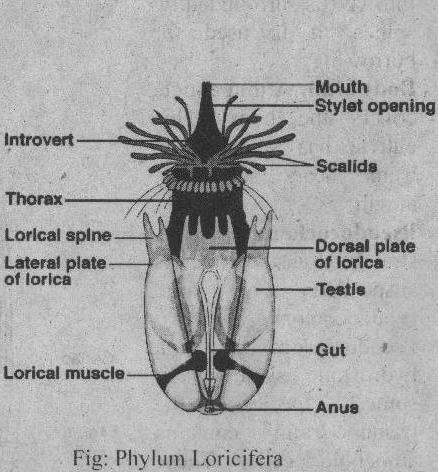 The phylum Loricifera is a recently described animal phylum. Zoologists have described !about 14 species of Loriciferans. Its first members were identified and named in 1983. Loriciferans live in spaces between marine gravel (sand + silt). A characteristic species is Name/oricits mysticav. It is a small, bilaterally symmetrical worm. It has a spiny head called introvert, a thorax and an abdomen. Abdomen is surrounded by a lorica. Loricilerans can retract both introvert and thorax into the anterior end of the lorica. The introvert contains eight oral styles that surround the mouth. The lorical cuticle is periodically molted. A pseudocoelom is present. It contains a short digestive system, brain, and several ganglia. Loriciferans are dioecious with paired gonads.