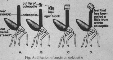 Auxin was discovered in coleoptile. It causes growth of the coleoptile of wheat, maize and other cereals. The tip of coleoptile produces auxin. Therefore, coleoptile shows rapid growth. When the tip is removed, the growth of the coleoptile stump stops. Auxin causes growth of the coleoptile by cell elongation. It also causes growth in stem by cell elongation.