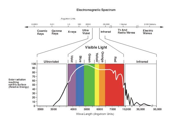 Sun provides al1 forms of energies in the earth. Solar energy reaches the earth in form of electromagnetic waves. The wave length of these waves ranges between 290-5000 millimicrons. The solar spectrum is divisible into visible and invisible spectra.