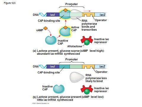 cell. There is shortage of ATP in bacteria in absence of glucose. Therefore, AMP changes in to Cyclic AMP (cAMP). The cAMP accumulates in the cell. CAP has binding site for binding site for cAMP. Thus CAP-cAMP complex is formed. It attaches with the promoter and stimulates the transcription of mRNA of 0- galactosidase. Now this enzyme starts breaking lactose.