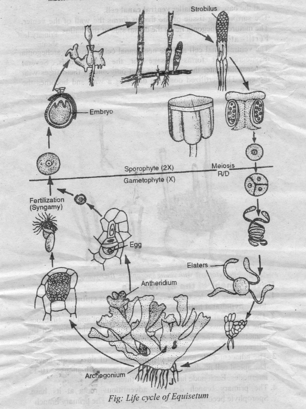 Equisetum shows a regular alternation of sporophytic and gametophytic generations. The sporophyte is diploid generation. It produces haploid spores after meiosis. These spores germinate to give rise to the gametophyte or prothallus. The gametophyte produces antheridia and archegonia in which male and female gametes are produced. The union of male and female gametes produces diploid oospore. Oospore gives rise to the sporophyte.