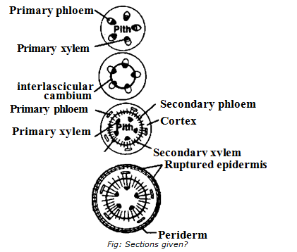 The internal structure of the stem is more complex. Stem is differentiated into nodes and internodes. The leaves are inserted on the nodes. The arrangement of leaves on the ‘nodes has made the stem more complicated. Stem has three fundamental systems. These tissues systems are epidermis or dermal tissues, ground tissues and vascular tissues. In conifers and dicotyledonous plants the vascular tissue system in an internode consists of strands or vascular bundles. They are arranged in a hollow cylinder. It divides the ground tissue into an outer region called the cortex, and an internal region known as the pith. The strips of ground tissues between the adjacent vascular are called medullary rays or pith rays. Medullary rays connect the pith with cortex.