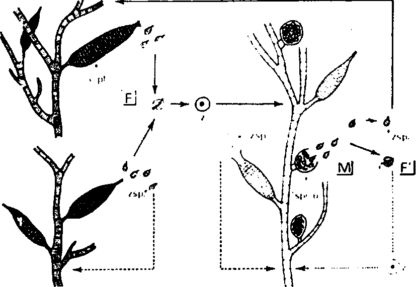 a) Sporophyte: The sporophyte is diploid. It develops two types of sporangia. Zoospores are produced in these sporangia. Zoospores are produced by mitosis (mitozoospores) in plurilocular sporangia. The zoospores in unilocular sporangia are produced meiotically (meiozoospores). The mitozoospores germinate into a diploid sporophyte. These spores cause reduplication of sporophyte generation. The meiozoospores germinate to give rise a haploid gametophyte plant.
