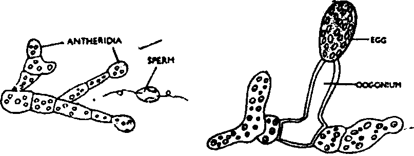Gametophyte: Gametophyte is haploid filamentous and microscopic. Antheridia are produced on male gametophyte. It produces haploid antherozoid. Oogonia develop on female plant. It produces egg. Fusion of antherozoid and egg produce diploid zygote. The zygote develops into diploid sporophyte.