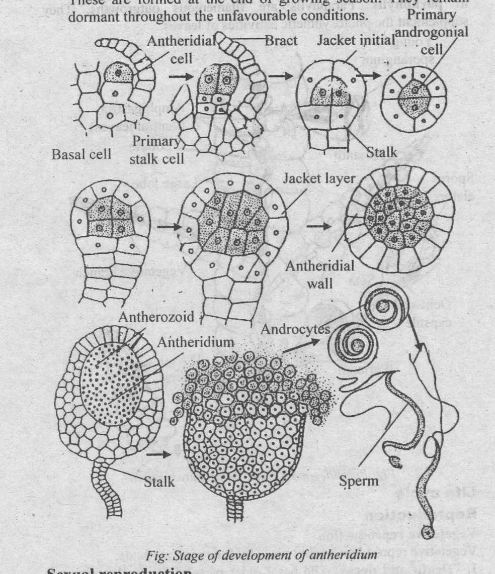 1. Gametophyte: The plant body is gametophytes. Gametophyte is haploid. It develops antheridia and archegonia. Antheridia oroduce antherozoids and archegonium produces egg. Antherozoids fuse with egg to produce diploid oospore.