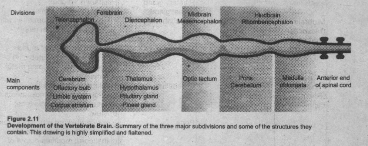 The brain of the developing embryo first becomes apparent as an enlargement of the anterior end of the neural tube. As the brain enlarges, it differentiates into three portions: the forebrain or prosencephalon; mid brain or mesencephalon; and hind brain or rhombencephalon. Associated with the enlargements, there is of necessity a folding which takes place primarily at three points: between spinal cord and hind brain is the cervical flexure; between hind brain and midbrain, the pointine flexure; and between the midbrain and forebrain is the cephalic flexure. The primary parts of the brain further divide as follows: Fig. 2.11