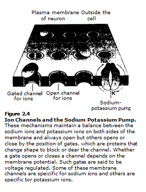 Resting membrane potential can be defined as the potential difference that results from the separation of charges along the plasma membrane of a neuron or other excitable cell. A resting neuron is not conducting a nerve impulse. The plasma membrane of a resting neuron is polarized, the fluid on the inner side of the membrane is negatively charged with respect to the positively charged fluid outside the membrane. The difference in electric charge between the inside and outside of the membrane at any give point is due to the relative numbers of positive (K± , Nat) and negative ions (Cr ions, huge negative protein ions) in the fluids on either side of the membrane, and to the permeability of the plasma membrane to these ions. Fig. 2.3 The Na’ and e ions constantly diffuse through ion channels in the plasma membrane, moving from regions of higher concentrations to regions of lower concentrations (except larger CI ions and negative protein ions which cannot move easily from inside of the neuron to the outside). However, the concentrations of Na + and K+ ions on the two sides of the membrane remain constant due to the action of the sodium – potassium ATPase pump, which is powered by ATP. The pump actively moves Na+ ions to the outside of the cell and K+ ions to the inside of the cell. Because it moves three Na+ molecules out , for each two e molecules that it moves in, the pump works to establish the resting potential across the membrane. Thus resting potential is maintained till there is a stimulus strong enough (threshold stimulus) to initiate an impulse.