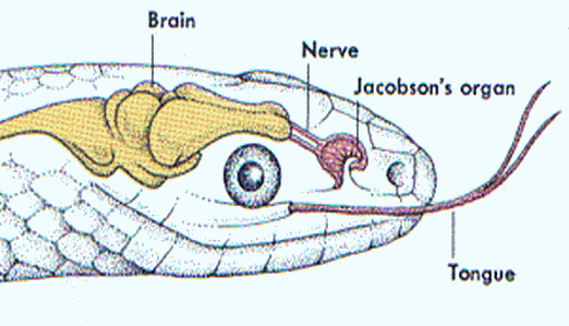 Olfactory senses are better developed in reptiles than in amphibians. In addition to having more olfactory epithelium, most reptiles (except crocodilians) possess blind-ending pouches that open into the mouth These  pouches, called Jacobson’s (vomeronasal) organs, are best developed in snakes and lizards. The protrusible, forked tongue of snakes and lizards are accessory olfactory organs used to sample airborne chemicals. A snake’s tongue flicks out and then moves to the Jacobson’s organs, which perceive odor molecules. Turtles and the tuatara use Jacobson’s organs to taste objects held in the mouth.