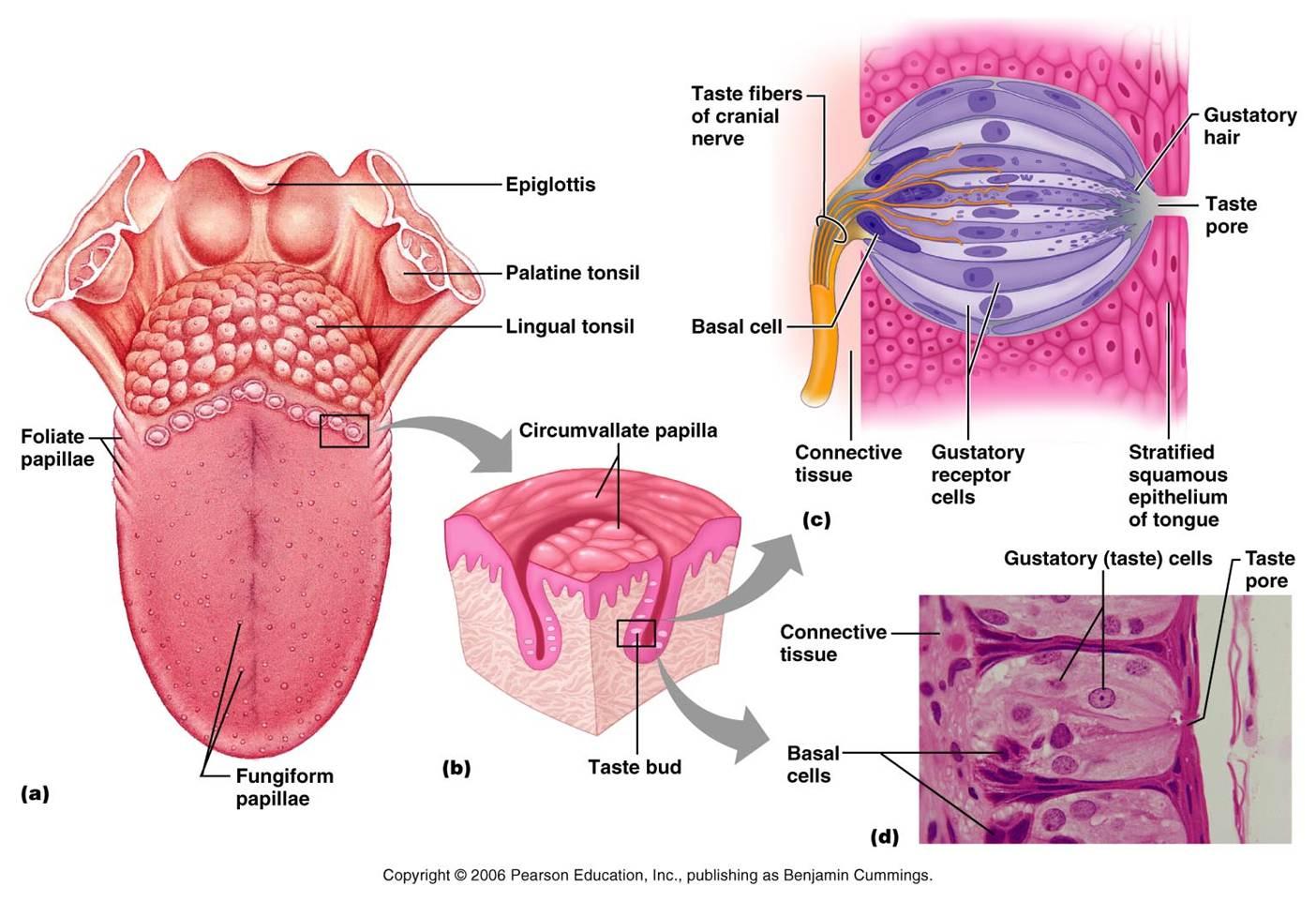 The four generally recognized taste sensations are sweet (sugars), sour (acids), bitter (alkaloids), and salty (electrolytes). The exact mechanism(s) that stimulate a chemoreceptor taste cell is/are not known. One theory is that different types of gustatory stimuli cause proteins on the surface of the receptor-cell plasma membrane to change the permeability of the membrane-in effect, “opening and closing gates” to chemical stimuli and causing a generator potential. Vertebrates  other    than mammals may have taste buds on other parts of the body. For example, reptiles and birds do not usually have taste buds on the tongue: instead, most taste buds are in the pharynx. In fishes and amphibians, taste buds may also be found in the skin. For example, a sturgeon’s taste buds are abundant on its head projection, which is called the rostrum. As the sturgeon glides over the bottom, it can obtain a foretaste of potential food before the mouth reaches the food. In other fishes, taste buds are widely distributed in the roof. side walls, and floor of the pharynx, where they monitor the incoming flow of water. In fishes that feed on the bottom (catfish, carp, suckers), taste buds are distributed over the entire surface of the head and body to the tip of the tail. They are also abundant on the barbels (“whiskers”) of catfish.