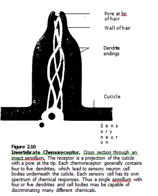 (b)Chemoreceptors respond to chemicals. This is the oldest and most universal sense in the animal kingdom. Protozoa avoid strong acids, alkali, and salt. Specific chemicals attract predatory ciliates to their prey. Chemoreceptors of many aquatic invertebrates are located in pits or depressions. In arthropods, the chemoreceptors called sensilla are usually on the antennae, mouthparts, and legs. Invertebrates with their specific chemoreceptors can detect humidity, access pH, track their prey, recognize food, and locate mate. For example, male silkworm (Bombyx mod) can detect one bombykol molecule. (sex attractant pheromone) in over a trillion molecules of air from several miles down wind. Fig. 2.16