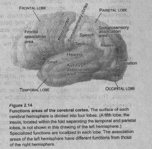 The limbic system, though still only loosely defined includes parts of the thalamus, hypothalamus, and inner portions of the cerebral cortex, including two nuclei called the amygdala and hippocampus, are said to be concerned with emotions and memory-learning, reasoning, and personality. Fig. 2.15.